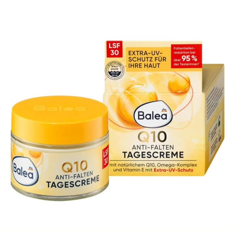 کرم روز Q10 باله آ با Q10 طبیعی،کمپلکس امگا و ویتامینE دارای خاصیت محافظت اضافی در برابر اشعه ماوراء بنفش. این محصول باعث جلوگیری از ایجاد لکههای رنگدانه مرتبط با نور خورشید و کاهش چین و چروک در بیش از ۹۵٪ آزمایش کنندگان میشود.